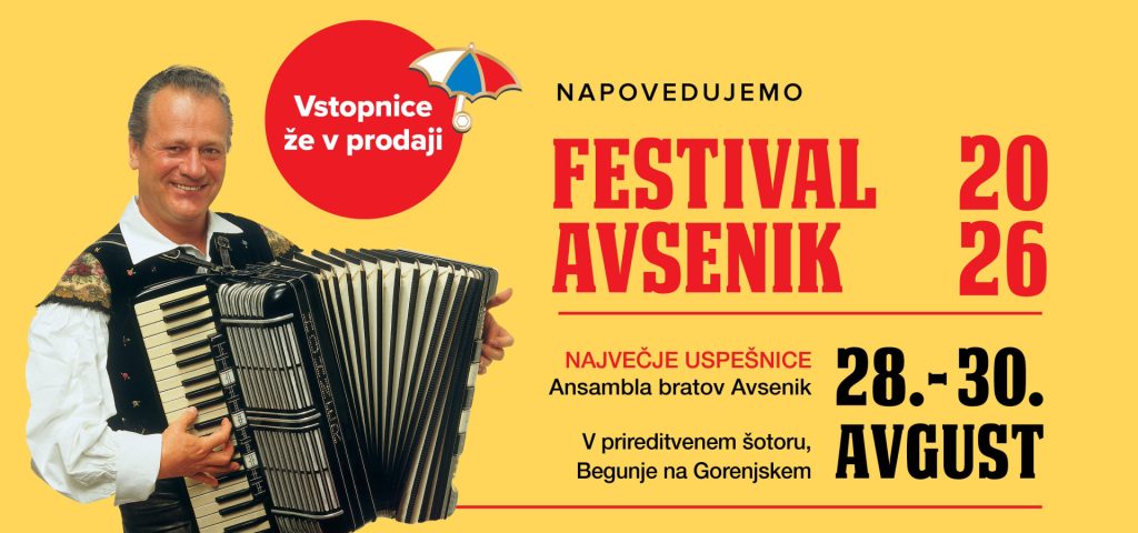 S ponosom napovedujemo že 8. festival Avsenik zapovrstjo! Največje uspešnice ansambla bratov Avsenik bodo odzvanjale od 28. do 30. avgusta 2026 v velikem prireditvenem šotoru v Begunjah na Gorenjskem. V treh glasbenih večerih se bo predstavilo več kot 20 domačih in tujih narodno zabavnih zasedb. Podrobni program Mednarodnega, Avsenikovega in Slovenskega večera lahko najdete pod zavihkom »Termini / avgust 2026«. Tam lahko najdete tudi povezave za nakup vstopnic.